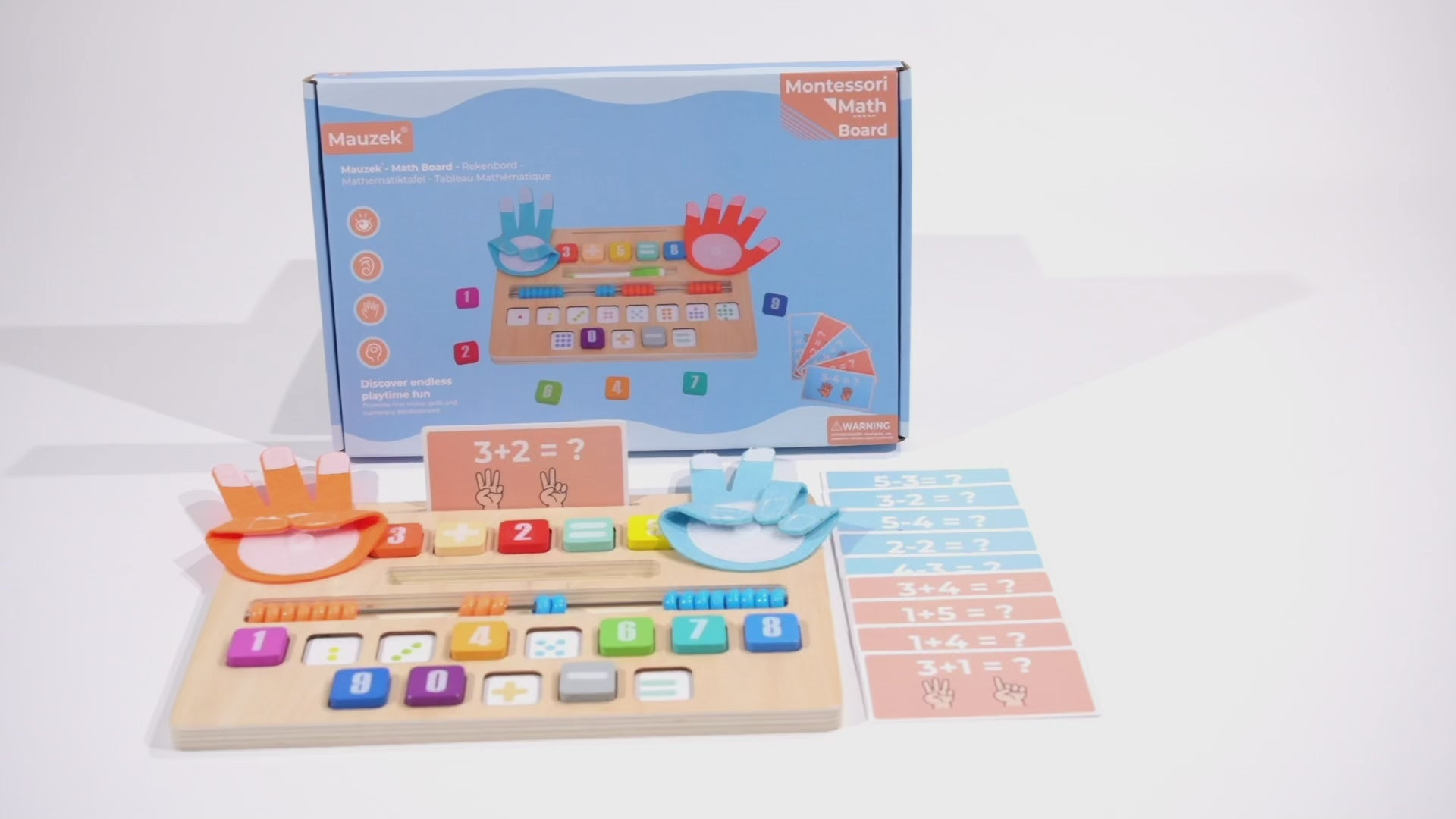 Het bord bevat cijfers van 0 t/m 9, rekentekens en verschillende oefenkaarten. Kinderen kunnen sommen nabootsen, tellen met kralen of met hun handen optellen en aftrekken. Door de verschillende speelmogelijkheden groeit het bord mee met de ontwikkeling van je kind.